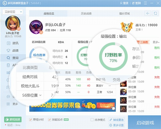 1、多玩英雄联盟盒子让玩家在游戏中的个人信息一目了然,便于实时跟踪进步。
