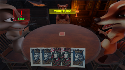 2、游戏提供两种玩法,首先是骗子牌模式:桌上四名玩家轮流出牌并声明牌值,可能虚报;若有玩家质疑可揭穿验证,虚报者接受俄罗斯轮盘惩罚,存活继续游戏,中弹出局。