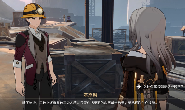 任务起始点在大红圈范围内,这里有四处可调查的木制方形箱子,每个箱子都堆放着废弃材料。首次调查任意一处箱子时,会触发关键对话,一位名为本杰明的角色出现,他表示需要这些废料用于后续制作。本杰明是下城区的一位热心居民,对话中透露出他对帮助孩子们的善意,玩家可通过互动了解他的背景故事。